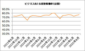 8月の全国ビジネスホテル客室稼働率は第1次速報値で76.8%であった。